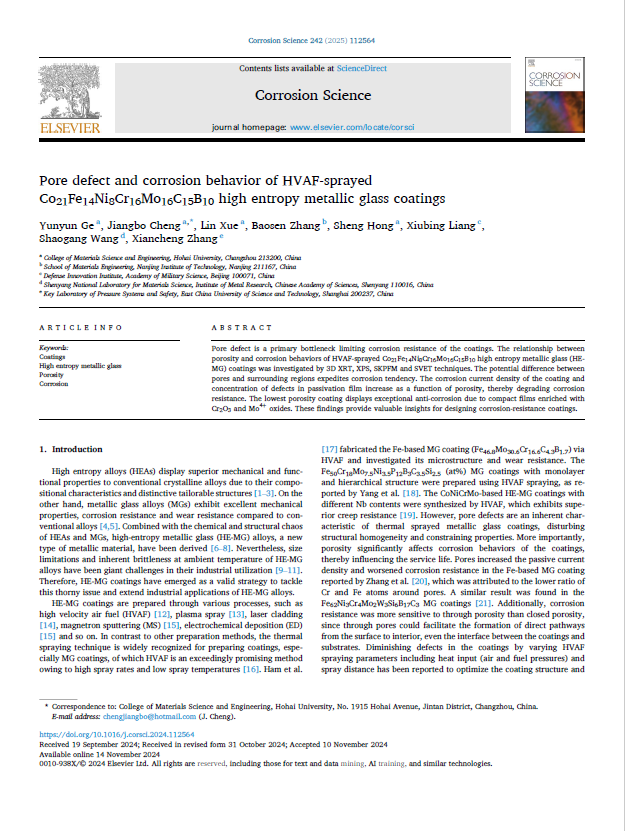 经过一年的研究探索,该项目在程教授的指导下已完成,通过对工作内容进行分析和总结,撰写结题报告,并于SCI期刊《Corrosion Science》发表论文一篇,《Pore defect and corrosion behavior of HVAF-sprayed Co21Fe14Ni8Cr16Mo16C15B10 high entropy metallic glass coatings》。